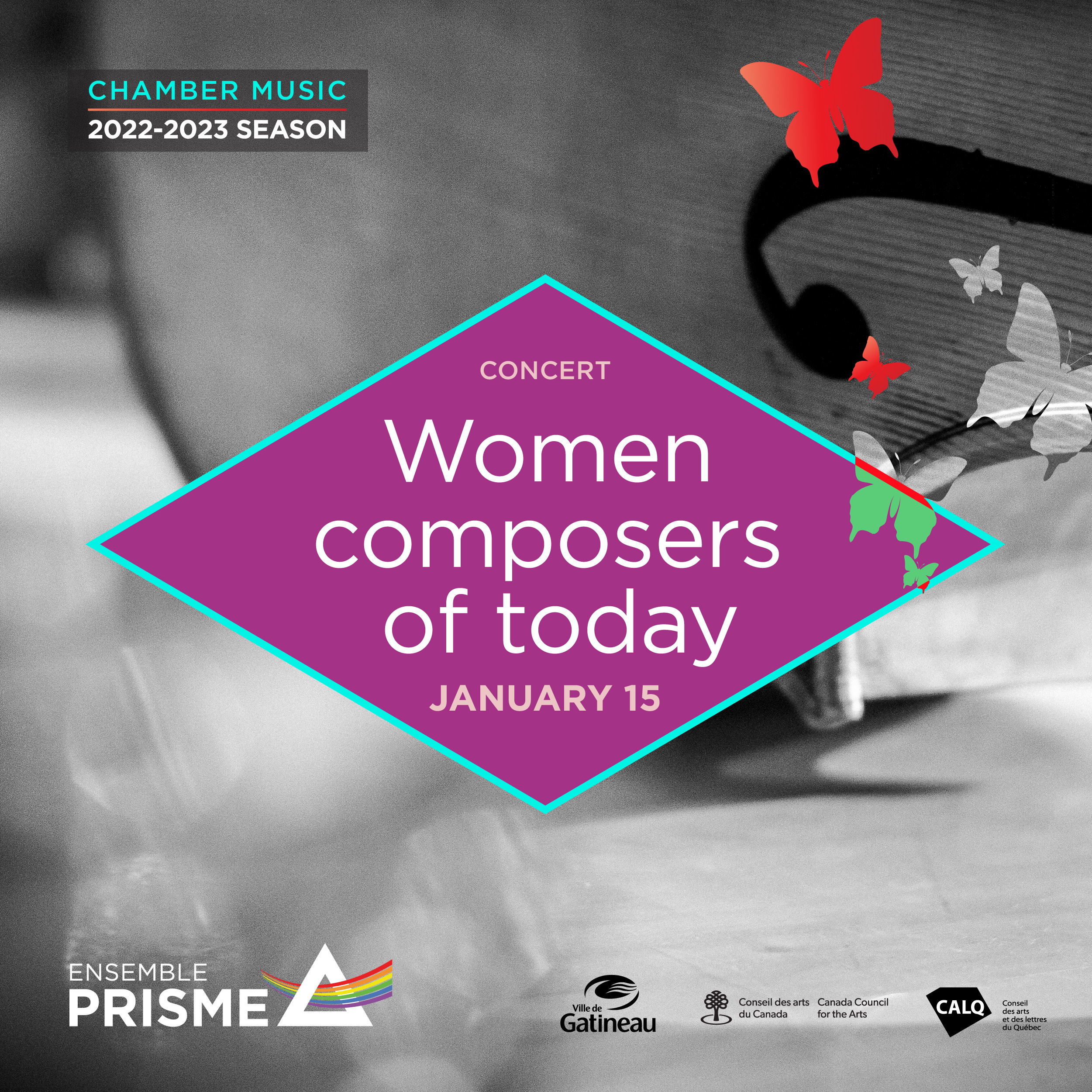 Ensemble Prisme pays tribute to contemporary women composers from Quebec and beyond. The ensemble will play music by five women, portraying five distinct musical universes. Two of the composers are connected: the young Keiko Devaux, winner recipient of a JUNO award and an Opus prize, among other prizes accolades, studied with Ana Sokolovic, also recipient of numerous awards, and brand new artistic director of the SMCQ, the oldest contemporary new music institution in Quebec. Their unique visions of the string quartet come together while being very different. will be contrasted.